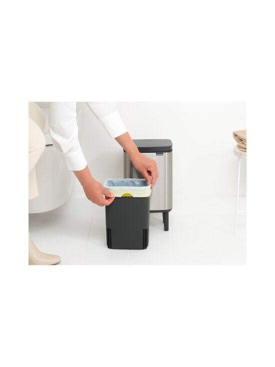 Ruumisäästlik Brabantia prügikast Bo Waste Bin sobib igasse nurka või ruumi. Selle mugav kaas avaneb kergesti prügikasti vasakult, paremalt ja esiküljelt, nii et sa ei pea enam kätt keerama, et midagi prügikasti panna.